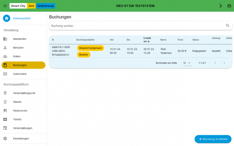 Dieser Abschnitt ist einer der wichtigsten für den laufenden Betrieb, da hier alle Buchungen eingesehen und verwaltet werden können. In der Übersicht bekommt man bereits angezeigt, welche Buchungsobjekte gebucht wurden, für welchen Zeitraum gebucht wurde (sofern verfügbar), wann die Buchung eingegangen ist, auf welchen Namen und zu welchem Preis gebucht wurde. Zusätzlich erhält man Informationen darüber ob die Buchung bereits freigegeben und bezahlt wurde (sofern nötig), sowie welches Zahlungsmittel genutzt wurde.