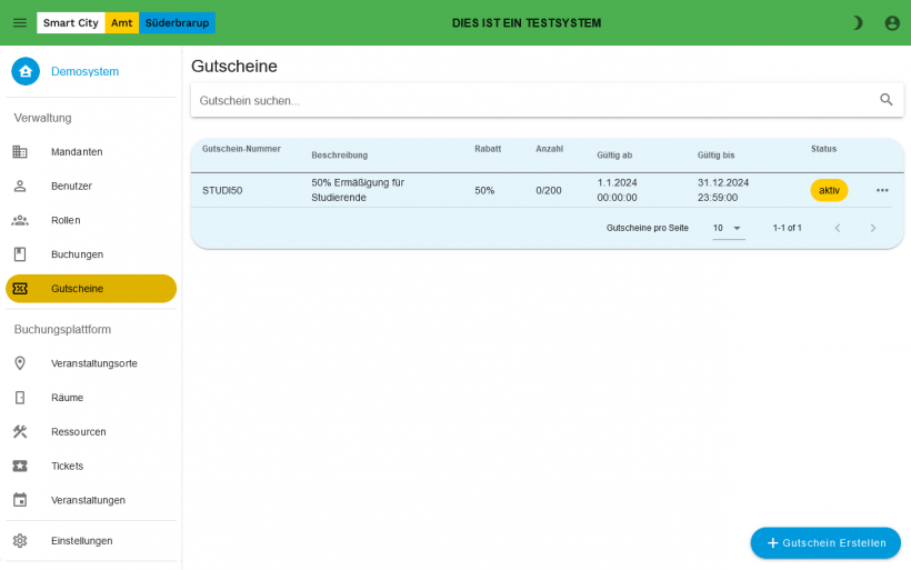 Hierbei ist wichtig zu beachten, dass bei einem festen Rabatt-Preis der Gesamtpreis niemals unter 0€ betragen kann. Sollte also jemand mit einem 100€ Gutschein eine 50€ Buchung durchführen, ist der Gutschein vollständig aufgebraucht und enthält kein Restguthaben mehr. Die Gutscheinnummer ist vollständig frei wählbar, sodass sie aus gemischten Zahlen- und Buchstabenkombinationen, aber auch aus verständlichen Worten und Zahlen bestehen kann. Beispielsweise kann ein Gutschein mit der Nummer "4V9UFOEr1YBF" erzeugt werden, aber auch ein Gutschein mit der Nummer "Rabatt50". Gutscheine können hinsichtlich der Einlösung auf eine bestimmte Stückzahl und / oder auf einen bestimmten Zeitraum begrenzt werden. Diese beiden Einstellungen (Stückzahl, Datum & Uhrzeit) können sowohl in Kombination als auch einzeln genutzt werden. Sollte ein Gutschein vorübergehend ausgesetzt oder erst viel später wieder genutzt werden können, ist es möglich den Gutschein vorübergehend zu deaktivieren. Somit muss dieser nicht gelöscht und später neu angelegt werden.